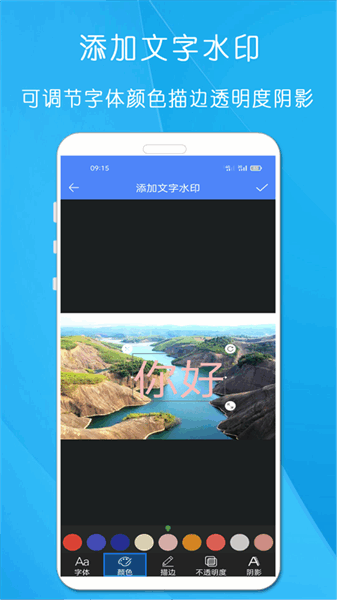 这是一款功能强大、简单易用的照片图片编辑软件,可以给图片添加文字和水印,可以调节字体大小,字体,颜色,描边,透明度,阴影,还可以移动文字到任意位置。可以对图片进行拼接,各种方式任您选!