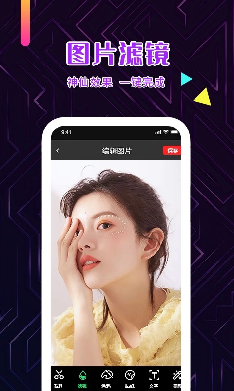 卖萌、搞怪、节日、可爱......各种风格的创意贴纸供你选择,一秒钟带你变身!
