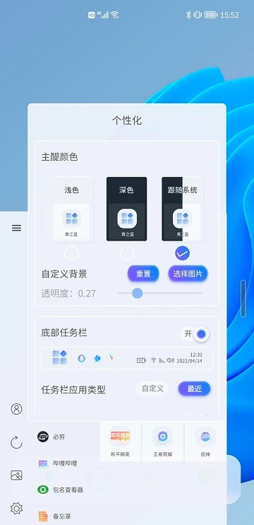 青之蓝是一款专为华为手机用户打造的主题壁纸软件,功能强大又小巧玲珑,让手机秒变Windows系统,带来全新的操作体验。你可以随意更换主题、布局和小组件,还能设计出独一无二的个性化桌面,视觉效果特别棒。操作简单,上手容易,完全不用担心不会用。