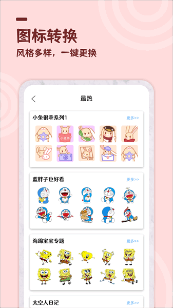 新增换图标功能,百余种图标样式可供您任意挑选,拥有与众不同的专属桌面,你的桌面你做主。