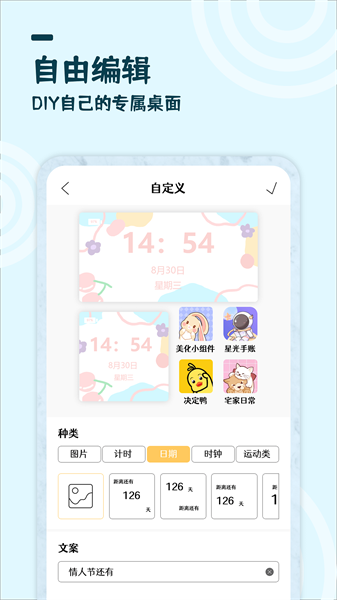 小组件功能齐全,包括备忘录、日期、天气、倒数日以及座右铭等,用户可根据自身需求进行编辑,带来独特的视觉效果,从而达到备注提醒的目的。
