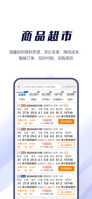 1、丰富的商品资源,包括棉花、短纤等多种纺织原料,智能订单管理提升采购效率。
