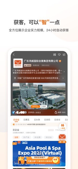 云展动力最新版是一款提供展业推广营销获客服务的应用软件,带来云产品、云数据、云展览、云采购、云招标、云招商、云直播、云头条、晕优惠等功能,帮助企业展示实力,智能追踪、精准定位目标用户,挖掘发现潜在的客户,打通全球市场!