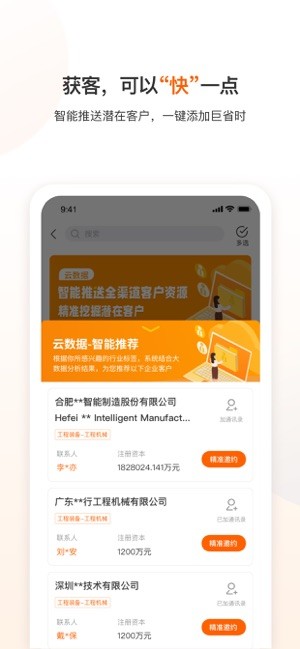 2、通过智能推送系统,将最符合您企业产品或服务需求的潜在客户精准推送到您的面前。这一过程不仅简化了繁琐的筛选工作,更通过一键添加的功能,极大地节省了您的时间与精力。让您能够迅速响应市场变化,抓住每一个可能的合作机会。
