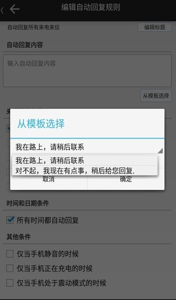 4、每个自动回复规则都支持多种条件(时间范围、日期范围、星期范围),还有其他条件例如(充电、震动等)