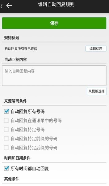 4、在编辑自动回复规则中,可以编辑标题和内容,也可以设置号码来源、时间、日期和其他条件