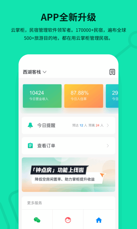 云掌柜运营平台是一款提供住宿经营管理的应用软件,具备丰富强大的功能,是专业化的名宿管理工具,还是多维生态资源整合英雄啊平台,带来一站式管理体验,覆盖面也十分广泛,满足商家的需要,操作轻松易上手,方便又高效!