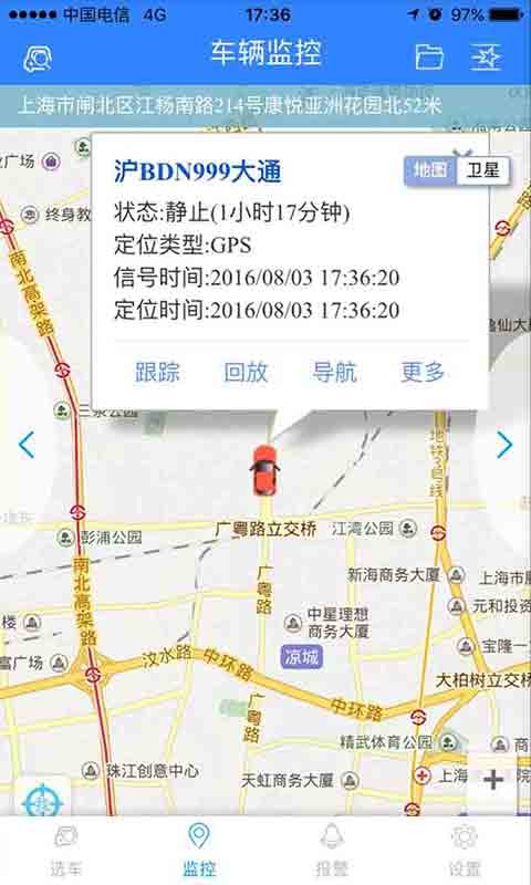 切换到监控中心查看地图车辆位置,浏览该车辆具体状态详情