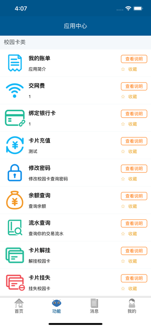 提供全面的校园卡服务,充值、信息查询、账单查询、流水查询、挂失/解挂、失卡招领、校园卡在线申请、校友注册等