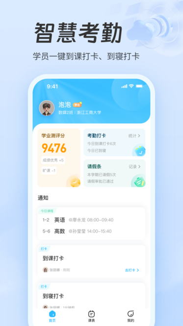 职教智慧云课堂软件是提供教育学习服务的应用平台,学员一键到课打卡、到寝打卡,支持在线请假,及时统计数据,实时通知最新消息,家校互联,课程学习更加高效,班主任在线点评,各项分数一目了然,排行榜随时查看,助力学习提升!