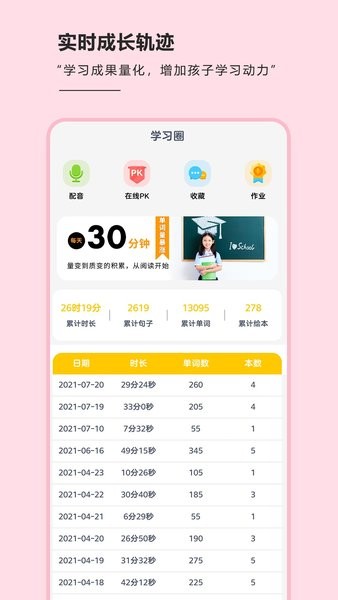 可视化数据图表报告生动清晰,详细记录孩子成长进步的每个足迹,积累英文词汇“金字塔”。