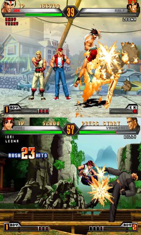 您儿时记忆中所熟悉的草S京、八神庵、不知火舞等经典人物,将延续当时的游戏场景、招式音效、必杀绝招、原汁原味日文配音,陪您再次体验热血激烈战斗,拳释经典,永不k.o!!