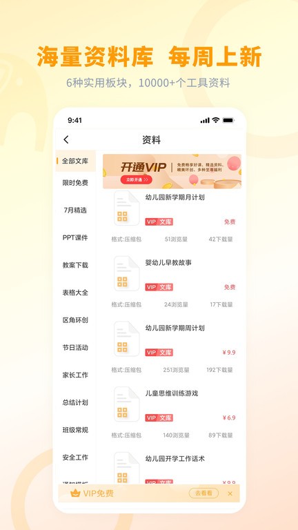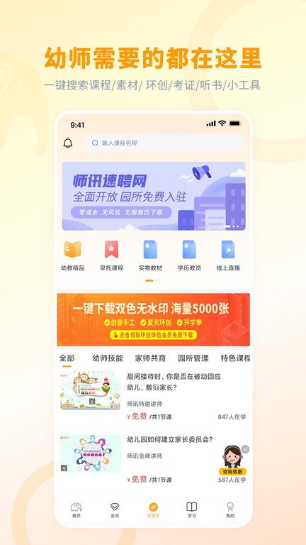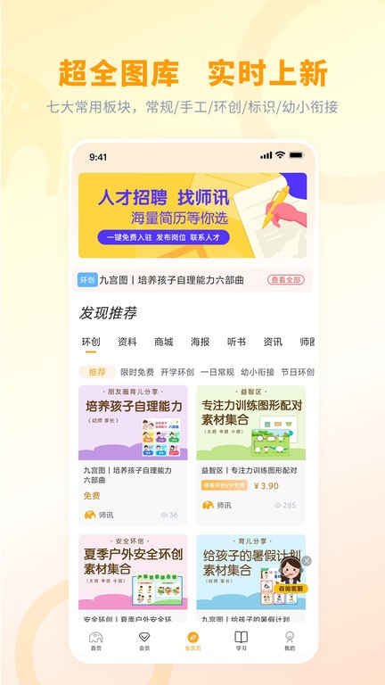 板块清晰:视频课程、音频、资料、环创、名师名课等幼师工作学习刚需。
