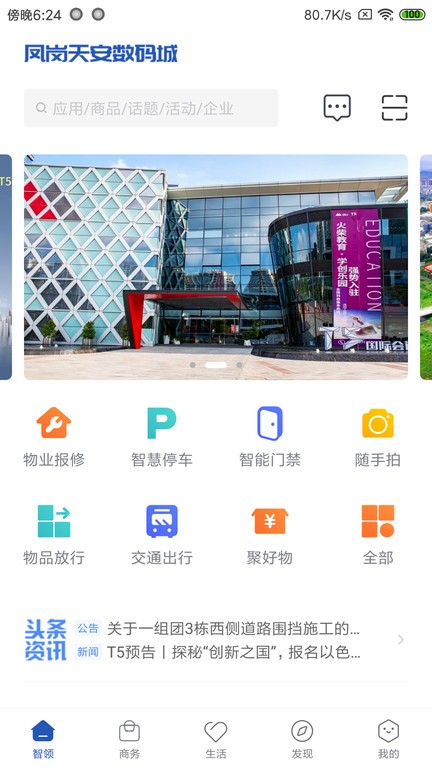 为企业和个人提供招商租赁、物业管理、安防门禁、智慧停车、园区服务、企业服务、在线缴费、日常消费、社交活动等服务。