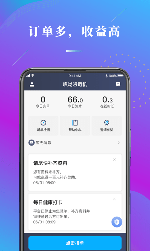 哎哟喂司机app为司机提供接单服务平台,一键成为哎哟喂司机,接单更省心,平台用户长期活跃,订单数量充足。给司机提供更高效,更合理,更简洁的服务平台。连接乘客,让出行更简单。
