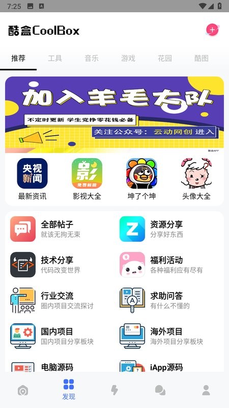 云动酷盒手机版是一款免费的工具箱APP,功能超级强大,里面啥都有!不仅可以分享资源、交流技术,还能提问求助、参加活动领福利。最棒的是它还有各种实用工具、高清音乐、好玩的游戏和酷炫图片,随便挑,随心用,完全满足个性化需求。