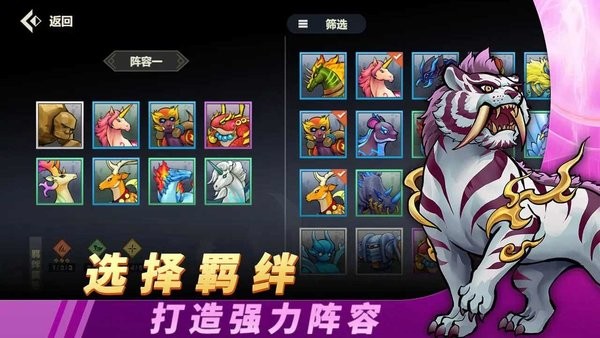 每只神兽都有1个羁绊,相同羁绊的神兽可进行羁绊升级,强力的羁绊能让你的棋子事半功倍!元初五灵、自然守护者、啸天凶兽、荒原之力......