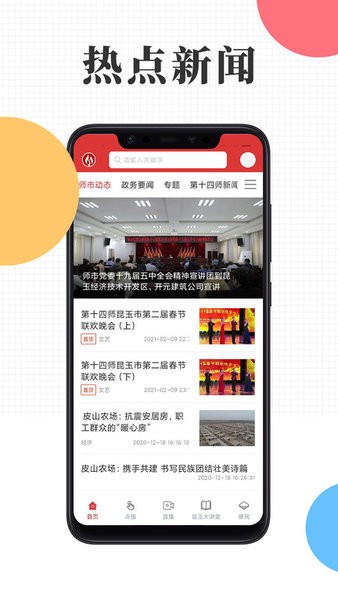 云上昆玉APP涵盖十四师地区的各类电视新闻、报纸新闻和调频94.5十四师新闻综合广播。