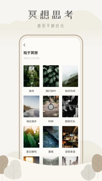 多个伴随你陷入冥想的音乐,让你在自我沟通的过程中能够感到心灵的洗涤,感受到世间的美好