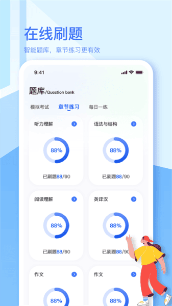 4、英语题库:名师精选英语考题,听力阅读翻译写作,逐个专项强化模拟训练。