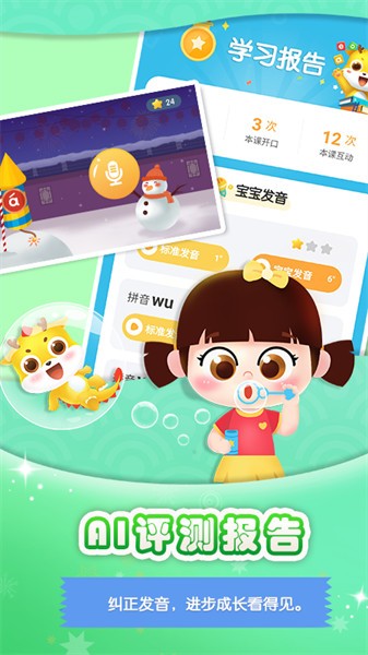 宝宝每完成一课或一个单元的拼音内容,系统将自动生成“报告单”,展示宝宝的拼音学习情况。设置Al发音评分功能,实时检测宝宝的发音准确度,精准打分,实时反馈。爸爸妈妈可以查看宝宝的拼音学习进度,掌握宝宝的拼音成长轨迹。