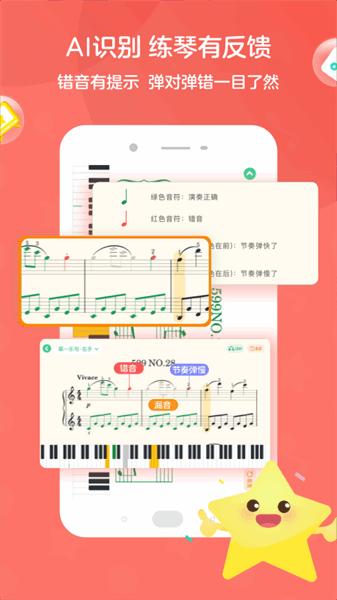 这个app还有一个智能纠错功能,能实时纠正弹奏中的错误音符和节奏问题,还能从五个维度(音准、节奏、速度、平稳度、完整性)来评分,帮你了解自己的进步。练完琴后还能生成报告,方便你自查自纠,提升学习效果。