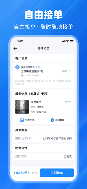 接单模式多,自主报价、标准一口价、总包指派,根据师傅自己时间安排、订单信息、服务距离等自由接单
