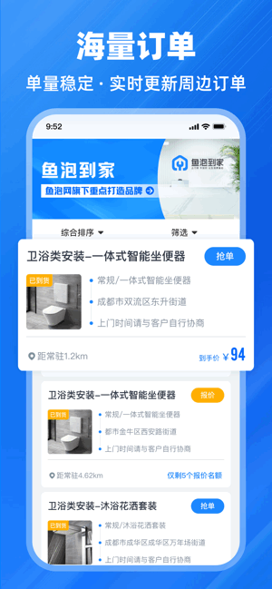 鱼泡到家师傅版,是鱼泡网旗下专为全国家居建材安装维修师傅打造的接单神器,订单多、接单快、免佣金、提现快。覆盖全国600个城市,3000个区县,与全国家居建材商家达成长期合作关系,海量订单长期稳定。