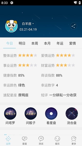 最让我觉得方便的是它提供了各种运势信息,包括明日、本周、本月甚至一年的运势,还能看到健康指数、商谈指数这些实用的信息。还有祈福灯的功能,可以在线祈愿,感觉挺温馨的。特别是生日解密和大师解读功能,能让人更深入了解自己的星座命盘,挺专业的。