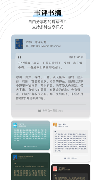 为你的收藏图书撰写想法/书摘,支持 OCR 文本识别,让内容录入更加便捷高效,同时也支持随时通过多种分享途径分享你的摘写 & 想法内容。