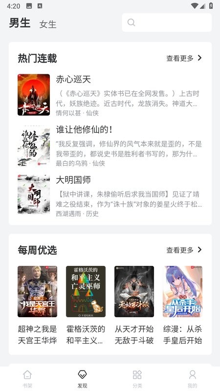 3、每周精选推荐,男生、女生,不同题材类型分类齐全,清晰