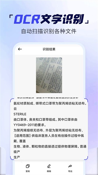 【文字识别】通过OCR文字识别技术自动扫描识别各种文件,图片,卡片并提取出想要的文字,可对识别内容进行编辑,扫描内容支持多种格式导出。