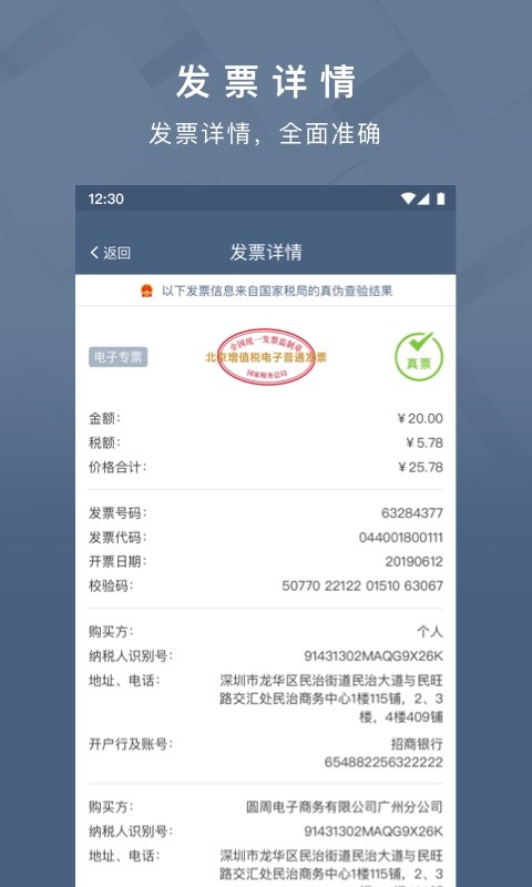 b、专业的发票管理软件,支持发票真伪查验、发票详情查看、统计分析等功能。