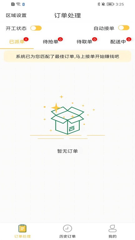 当选择自动接单为打开时(按钮为黄色),则代表所有系统给您的派单,都不需要您再手动点击,系统直接帮您自动接单。