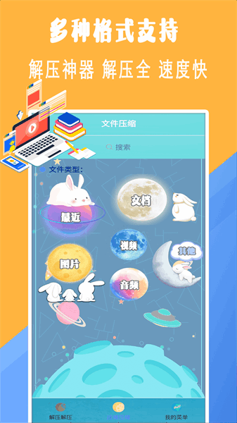 解压神器,格式全速度快,同时支持文件压缩与解压。专业的集解压缩/压缩和文件管理于一身的工具。可以一键解压zip、7z、rar等格式的压缩包。