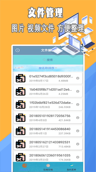 3、可以将压缩文件按时间、大小、备注排序,方便管理。