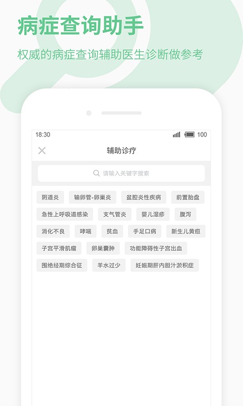 3.病症查询:辅助诊疗病症查询,为医生诊断做病症参考。