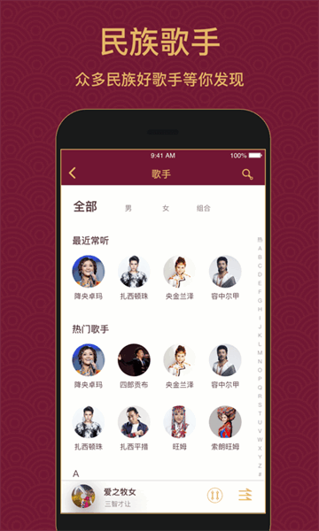 3、运用将各种各样中华民族歌星按名字首写开展了排列,便捷客户寻找自身喜爱的歌星接听他的着作;