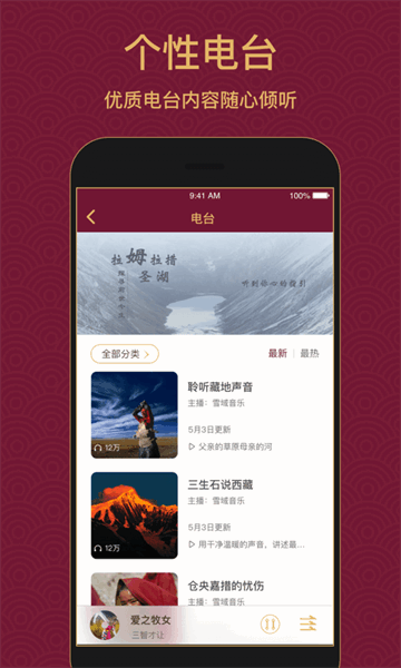 雪域音乐是一款非常适合藏族同胞及藏歌爱好者的移动互联网应用产品。它具有更人性化的操作界面,清新简洁,点划之间尽享畅爽体验;更有海量藏歌、影视金曲、藏族弹唱、雪域舞曲、原声伴奏等,你要找的藏歌尽在“雪域音乐”。