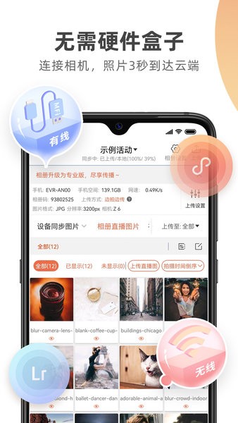 photoplus图片直播app可以和相机硬件配合使用,兼容的相机品牌和型号广泛,可以将相机里面的照片轻松上传,能够便捷的传送直播图,支持断点续传,不影响传输图片的像素,传输速度极快,能够创建专属的相册!