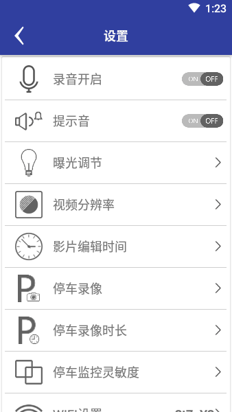 软件还有一些贴心的小细节,比如循环录像的时间设置和延时关机选项,这些都很符合我的使用习惯。特别是曝光设置开启后,拍出来的画面更清晰,这点特别棒!不过我有点担心隐私问题,尤其是在车内录音的时候,所以一般都会暂时关闭声音录制功能,避免泄露个人信息。