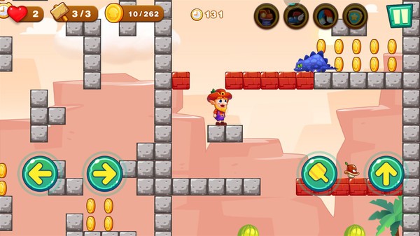 这是一款跑酷题材的冒险游戏,类似经典的FC小霸王游戏超级玛丽,可以采蘑菇,顶蘑菇,发射子弹,主人公为了寻找传说中的宝藏,踏上了冒险的旅程,游戏中共有5个不同的场景,多达80个精心设计关卡,无数种未知的怪物。