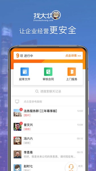 找大状app是由深圳市找大状法务科技有限公司研发的一款智能IM即时法律服务应用,以为中小企业提供即时、高效、便捷、专业的法律服务为核心理念。找大状平台通过APP能够实现客户需求3分钟响应,律师团队实时交互。客户可以在APP上一键发起法律需求,简单方便快捷;而法务团队则能够通过APP实时响应客户需求,解答客户疑难问题,并且能够通过APP一键提交客户所需的法律文书、合同、规章等等。找大状APP,标示着找大状服务的又一次的全面升级,在法律服务质量与服务效率这条路上,我们一直坚守前行。
