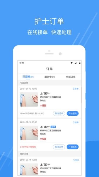 *快速抢单:用户下单,发布所需要的医疗护理服务,“护士端”用户根据需求抢单,在订单有效期内抵达服务地点完成订单。