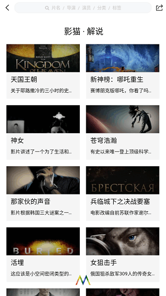 影猫电影手机版是一个免费影视app,包含电影、电视剧、动漫、纪录片等各类视频资源,可以参与到话题互动,看各种精彩点评,搜索喜欢的资源随时随地任您播放!来自院线、互联网的最新资源每日都实时更新哦~