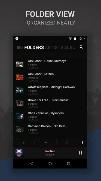 您可以使用强大的可用设置根据自己的喜好调整设计。在屏幕中间滑动以在页面之间导航。点击顶部标题以获取其他选项。 mp3 音乐播放器记录您播放次数最多的艺术家和专辑,为您提供一个名为“立即播放”的智能起始页,并提供播放建议。