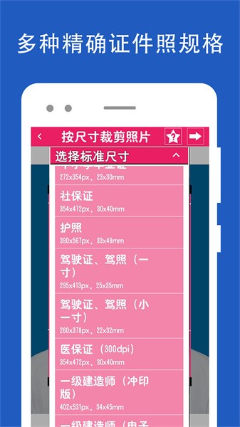规格齐全:按规格或自定义自动裁切照片,智能证件照轻松制作;包含国内外多种证件照尺寸模板