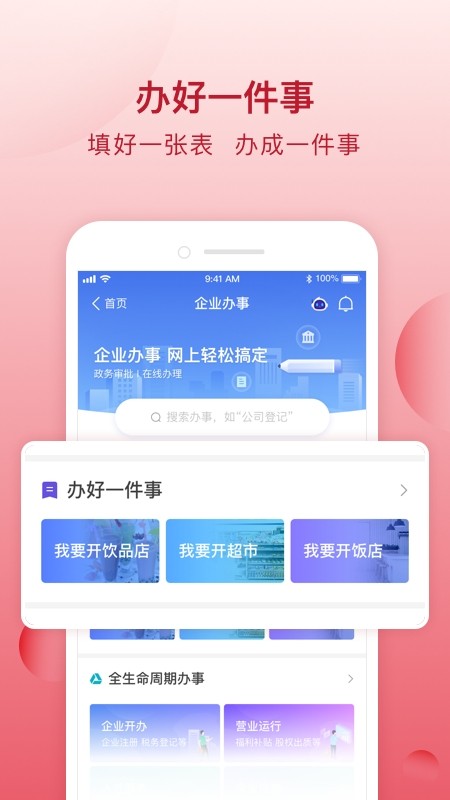 提供主题事项的移动端办理,目前已上线“我要开超市”、“我要开饭店”等八十项办好一件事主题服务。