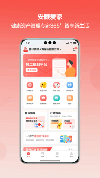“安顾爱家”依托德华安顾人寿保险公司健康方案解决能力融合保险理赔、线上购药、健康商城、企业医务室、健康档案等场景,为企业及客户提供一站式健康管理解决方案,帮助企业和客户实现全面的健康管理,智享新生活。