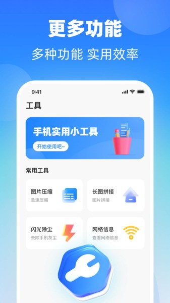-- 内置了多种惊喜实用小工具,如图片压缩、长图拼接、闪光除尘、网络信息等